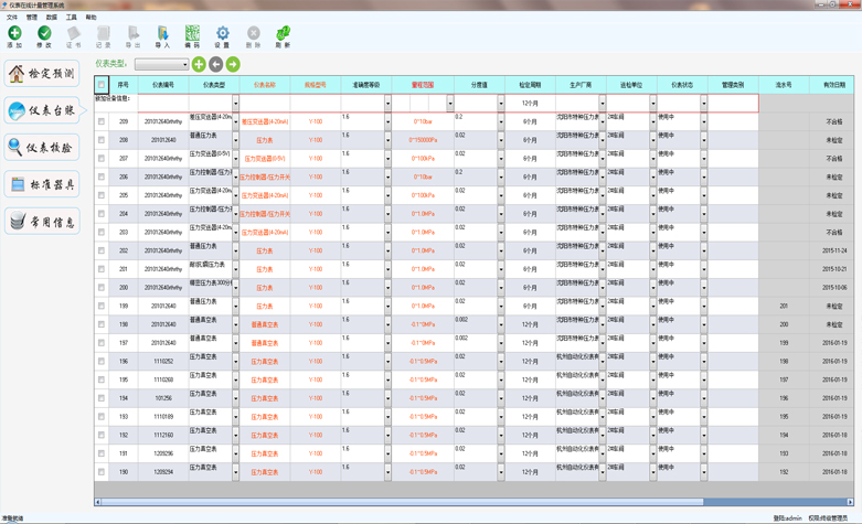 軟件主頁面,“臺帳”項,可對儀表臺賬信息進行管理,添加、修改、刪除等操作,可以進行導入和導出批量處理。并支持二維碼掃描槍快速查找模式。